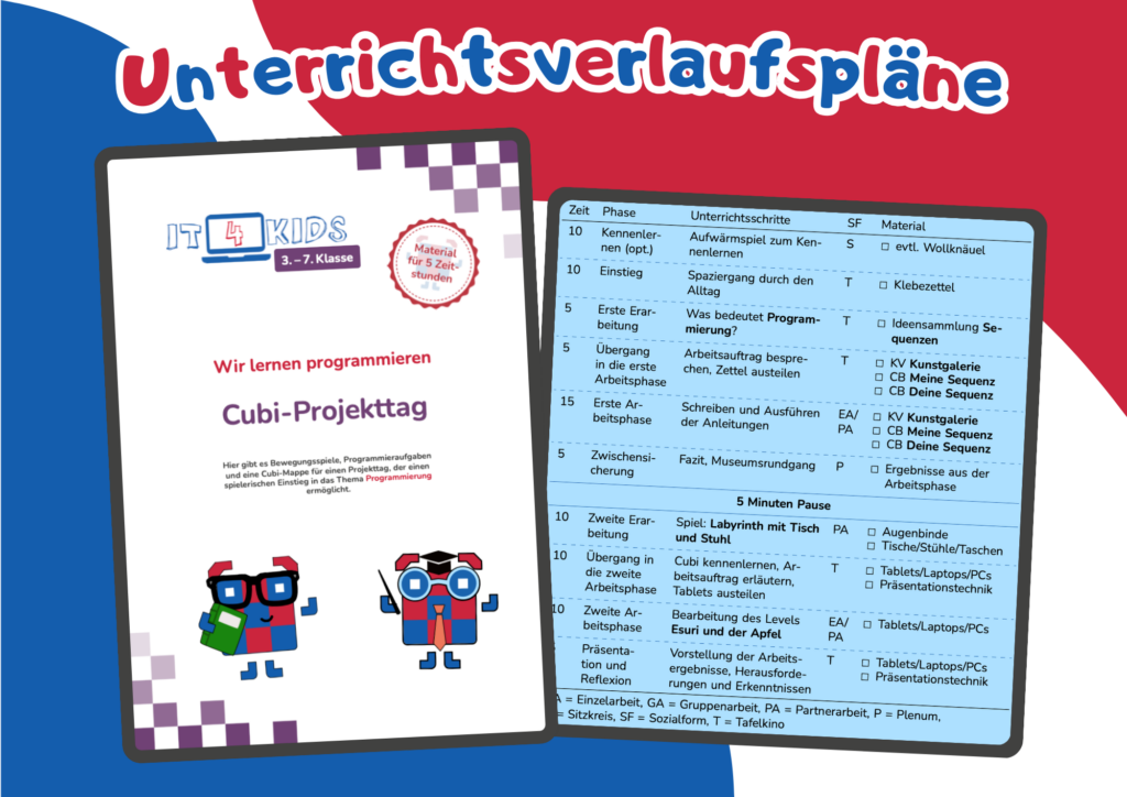 Das Unterrichtsmaterial für den Cubi-Projekttag umfasst detaillierte Stundenplanungen, Arbeitsblätter und Kopiervorlagen für bis zu 5 Zeitstunden voller Programmierspaß. Die Schülerinnen und Schüler tauchen ein in die Welt der Algorithmen und Programmierung.